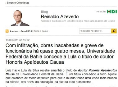 Após a divulgação de que a Universidade Federal da Bahia (Ufba) concederá o título de doutor Honoris Causa ao ex-presidente da República, Luiz Inácio Lula da Silva, nesta terça-feira (20), o colunista Reinaldo Azevedo, da Revista Veja, escreveu em seu blog no portal do periódico um texto de críticas ao petista e à instituição de ensino. “Com infiltração, obras inacabadas e greve de funcionários há quase quatro meses, a Universidade Federal da Bahia concede a Lula o título de doutor Honoris Apaídeutos Causa”, é o título do comentário feito por Azevedo, que considera que a honraria serve para “todo aquele que colabora de modo definitivo para que o mundo tenha uma visão mais bronca da ciência, das artes, da educação, da cultura e do humanismo". Ele ainda publicou uma imagem antiga de um prédio do campus de Ondina para exemplificar a “degradação” da academia baiana. Em resposta ao artigo de Azevedo, o professor titular e pesquisador da Faculdade de Comunicação (Facom-Ufba), Wilson Gomes, comentou, por meio do seu perfil no Twitter: “Estou há mais de 20 anos na Ufba e no sistema nacional de ciência e tecnologia. Nunca vi nem um nem outro dotado de tantos recursos”. Em seguida, complementou: “Qualquer um que faça pesquisa no Brasil confirmará: nunca houve tantos recursos para Ciência e Infraestrutura quanto no governo Lula.”